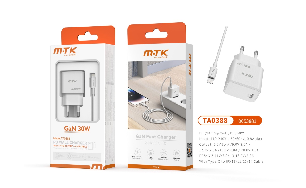 TA0388 BL Luxury Cargador GaN Rapido de Red Devin, 1 puerto USB-C PD, Con Cable Type-C a Lightning, Iniciar sesión para ver precios