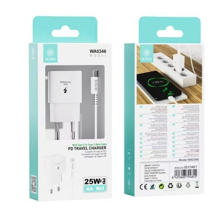 IKREA WA0346 CARGADOR PD CON CABLE TYPE-C TO TYPE-C 25W 4A MAX BLANCO Y NEGRO