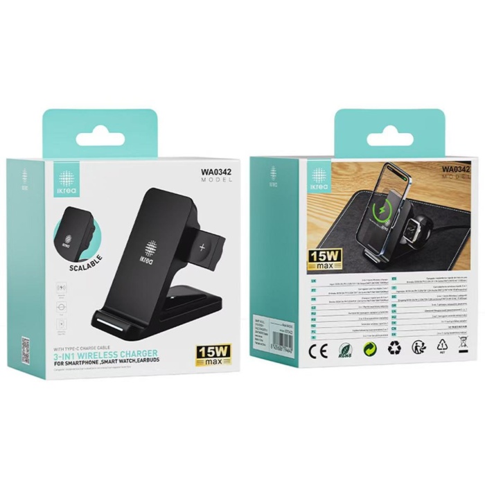 IKREA WA0342 CARGADOR INALÁMBRICO ESCALABLE 3 EN 1 CON CABLE TYPE-C PARA MÓVILES/AURICULARES/SMART WATCH 15W MAX NEGRO