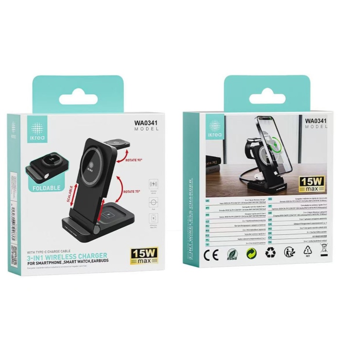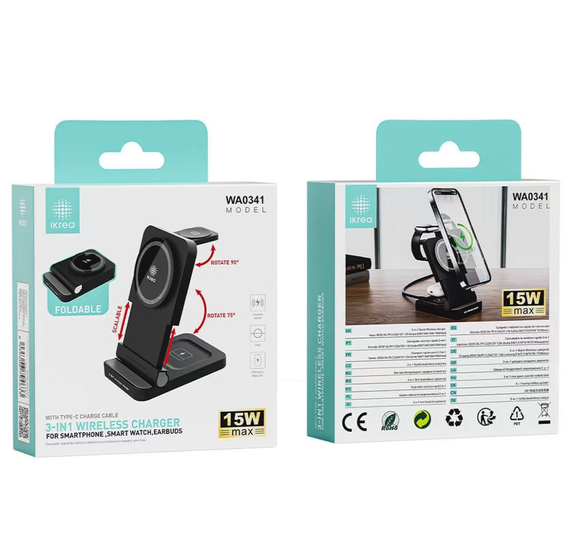 IKREA WA0341 CARGADOR INALÁMBRICO PLEGABLE 3 EN 1 CON CABLE TYPE-C PARA MÓVILES/AURICULARES/SMART WATCH 15W MAX NEGRO