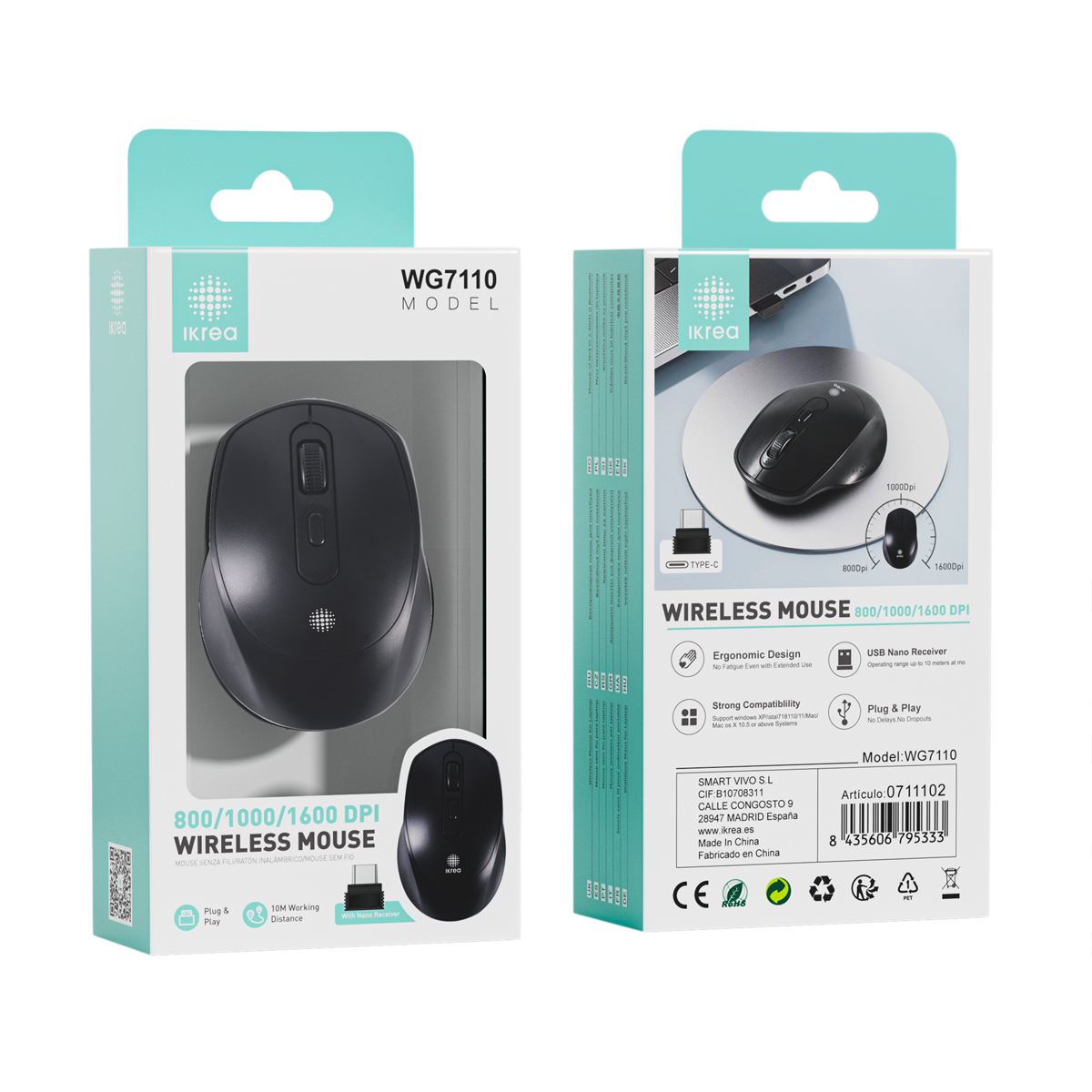 IKREA WG7110 RATÓN INALÁMBRICO CON NANO RECEPTOR TYPE-C 800/1000/1600DPI NEGRO