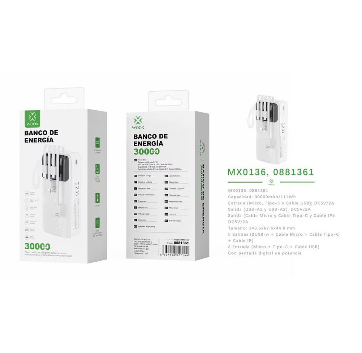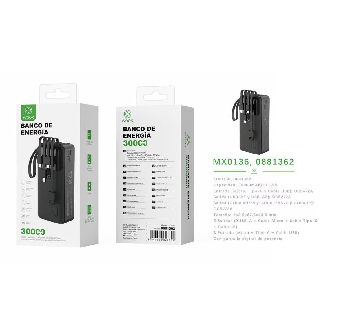 MX0136 POWER BANK 30000MAH 5V2A WITH 4 CABLE ABS+PC-NEGRO Y BLANCO