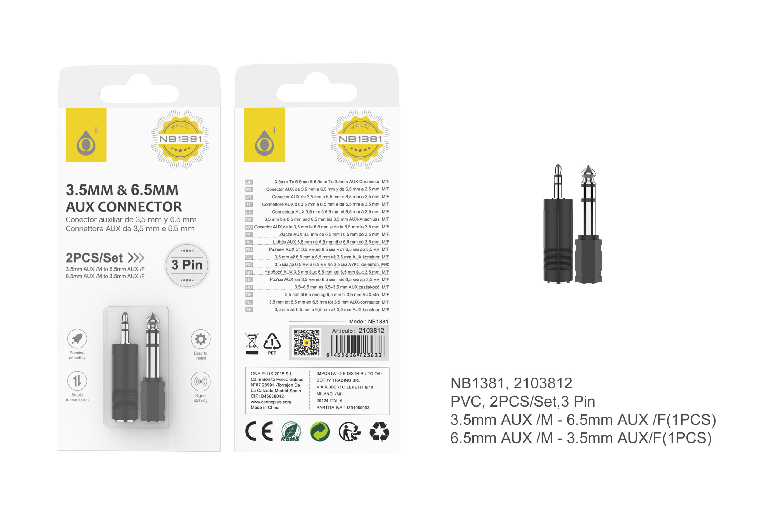 NB1381 NE Adaptador AUX Pack de 2 ,(AUX 3.5 Macho a 6.5 Hembra),(AUX 6.5 Macho a 3.5 Hembra) , Neg
