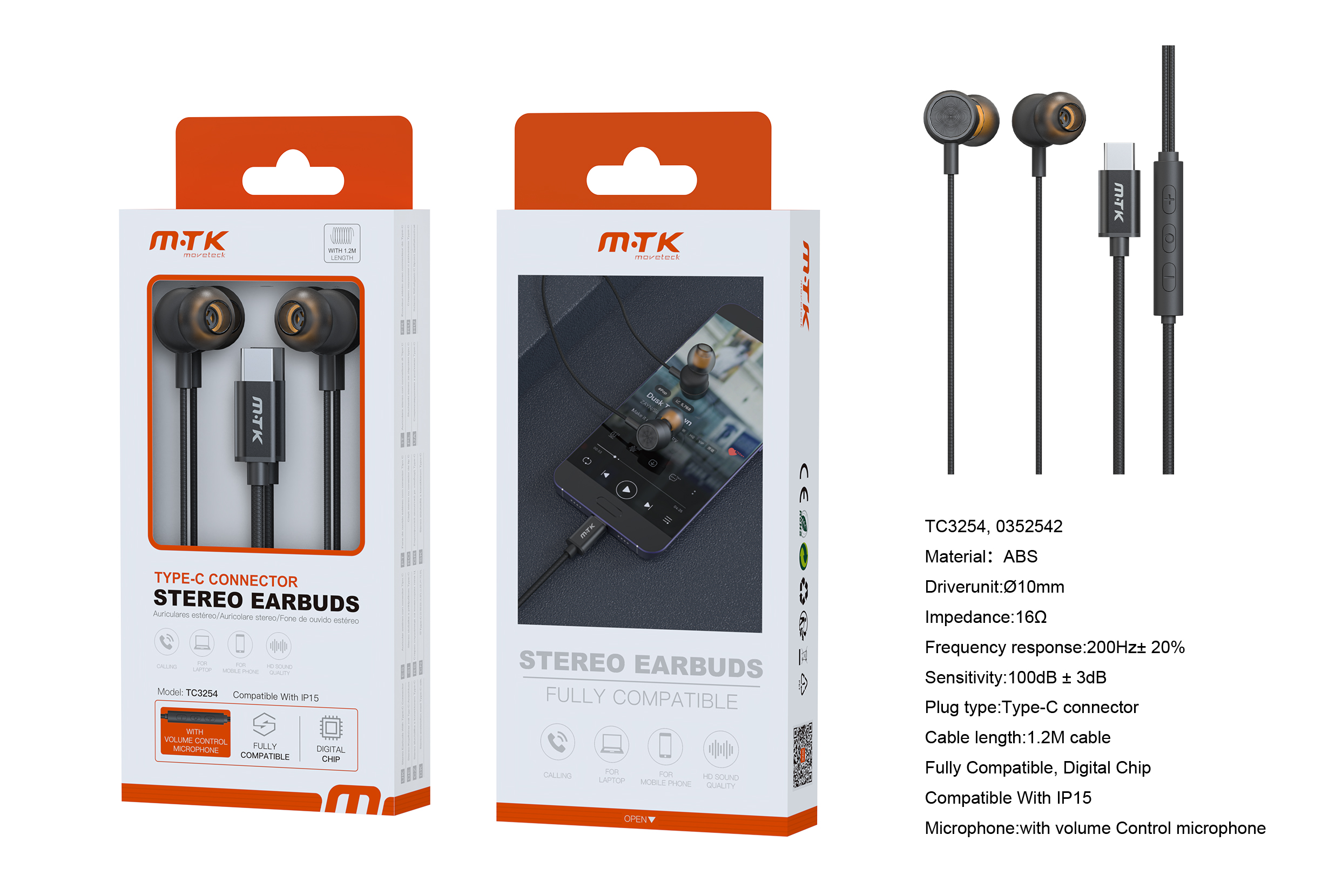 TC3254 BL luxury Auricular Type-C Ezra con Microfono y Control de Volumen, Compatible con Apple Type-C, Soporta llamada y Musica, Cable 1.2m,
